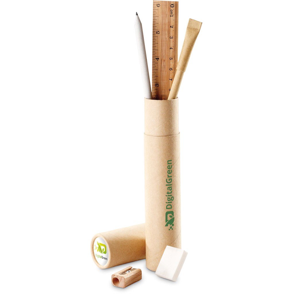 This unique and functional recyclable stationary set is the ideal promotional set to show your support for a greener environment. It is packaged in an eco-friendly natural colour cylinder and includes, recycled pen barrel, recycled newspaper pencil, bamboo ruler, wooden sharpener and an eraser.
