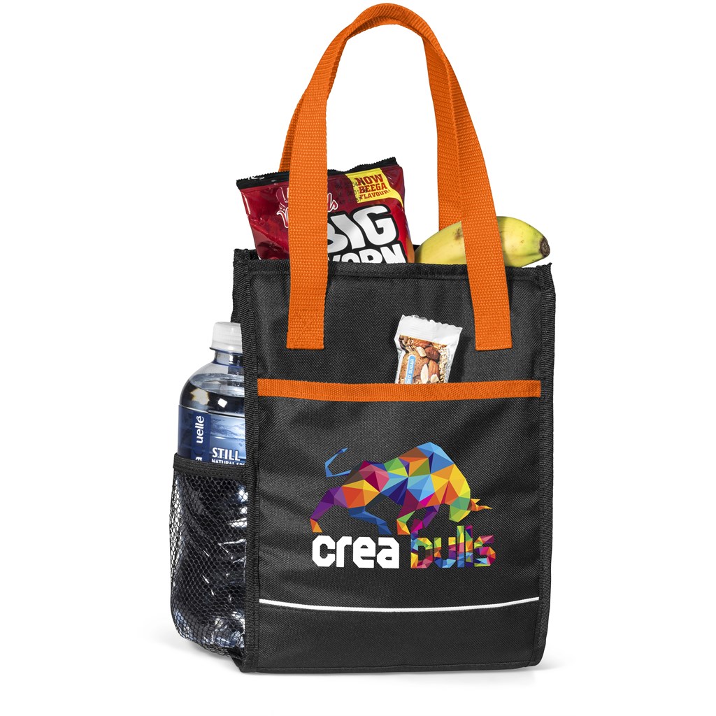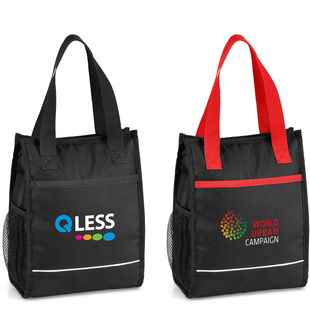 Bright and trendy. Main zippered compartment with silver PEVA lining. Front slip pocket with colour trim. Side mesh water bottle pocket. Small I.D window at the back of cooler. Colour accented double carry handles.