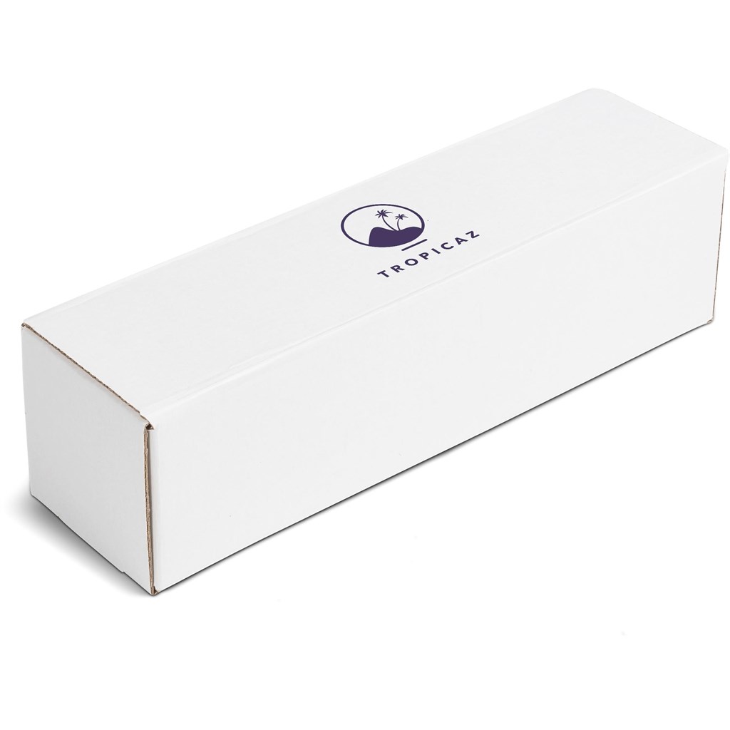 Consider elevating and customizing your bottle gift by packaging it in a gift box branded with your logo or message. A bottle of wine or liquor is a favourite gift choice for many, and packaging it in a branded box adds a finishing touch. Simple 1-colour, 1-position branding is available on this white box. If you’d like larger coverage, full-colour branding, then please consider the PG-AM-400-B natural kraft box.