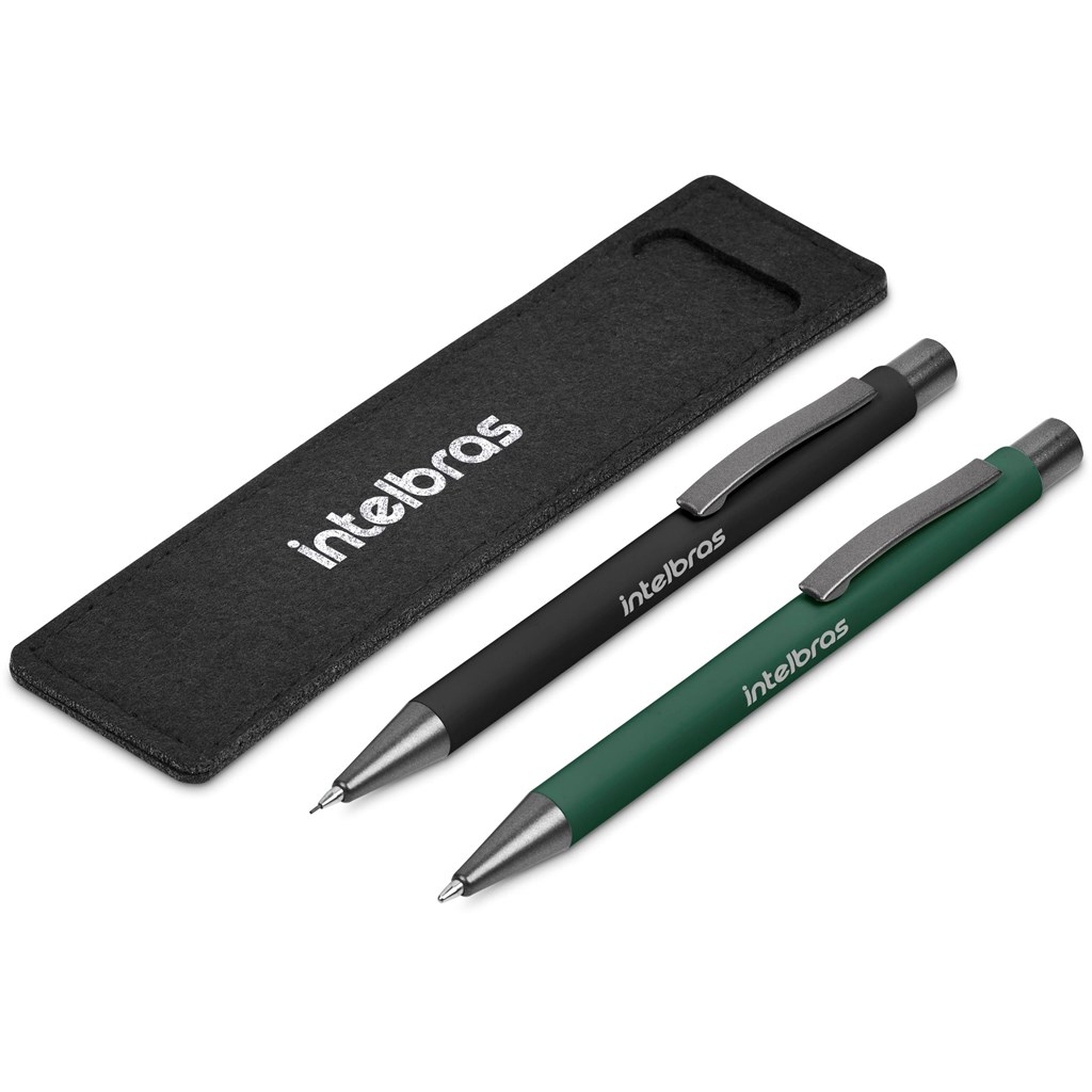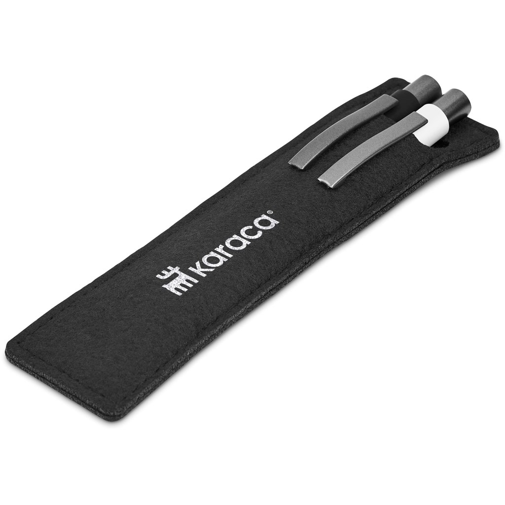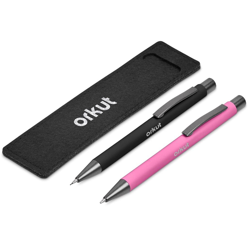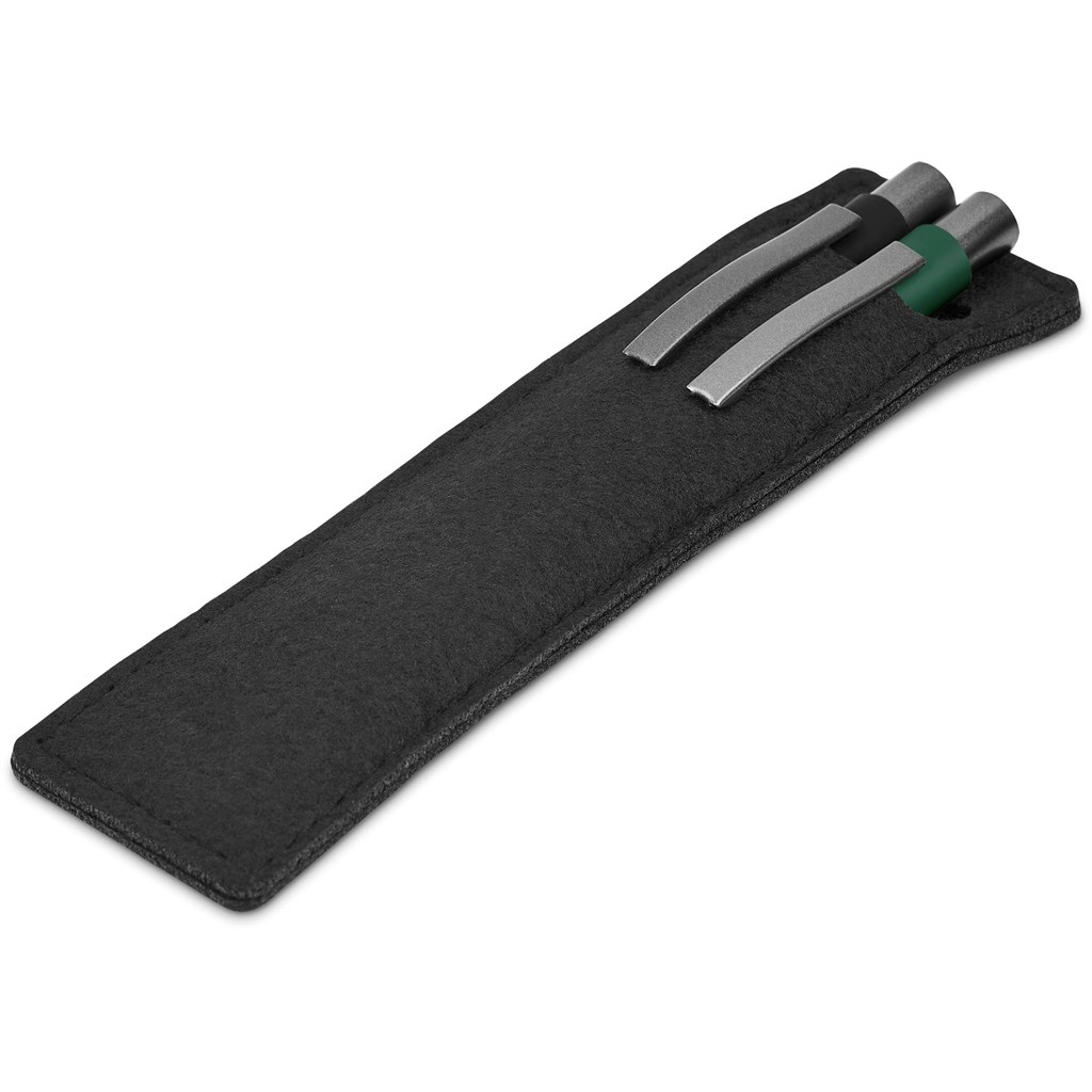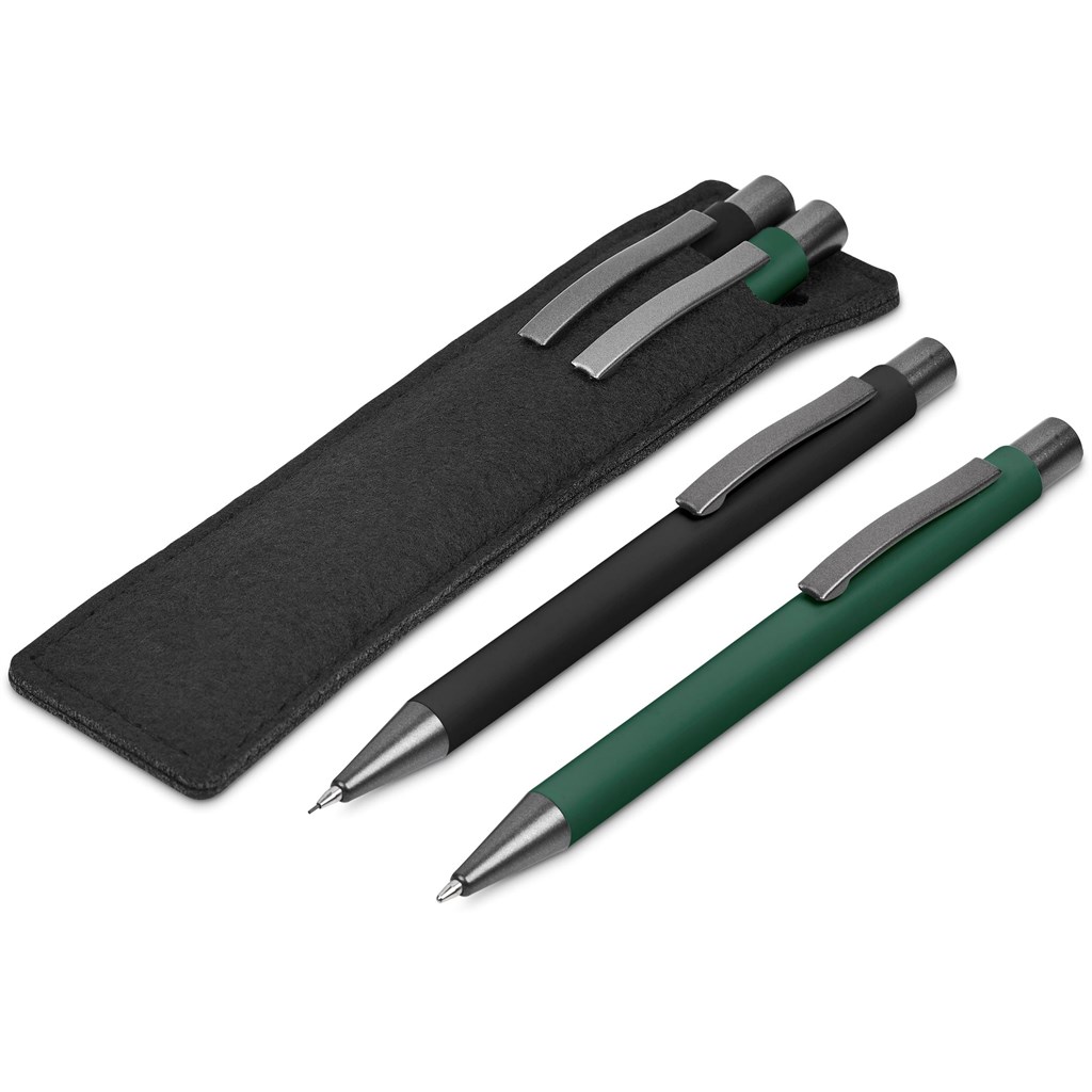 A black metal pencil and a metal pen in a choice of colours are paired together in a black pouch made from RPET felt. Laser engraving on the rubberised finish barrel of the pen and the pencil provides a clean precise effect which is both subtle and visible. The ball pen refill contains good quality, black German ink and will provide smooth, uninterrupted writing for a minimum of 1,500 metres. The pencil is fitted with break-resistant 0.5mm lead. A set with a different colour pen and pencil makes it easier to instantly identify which is the pen and which is the pencil.