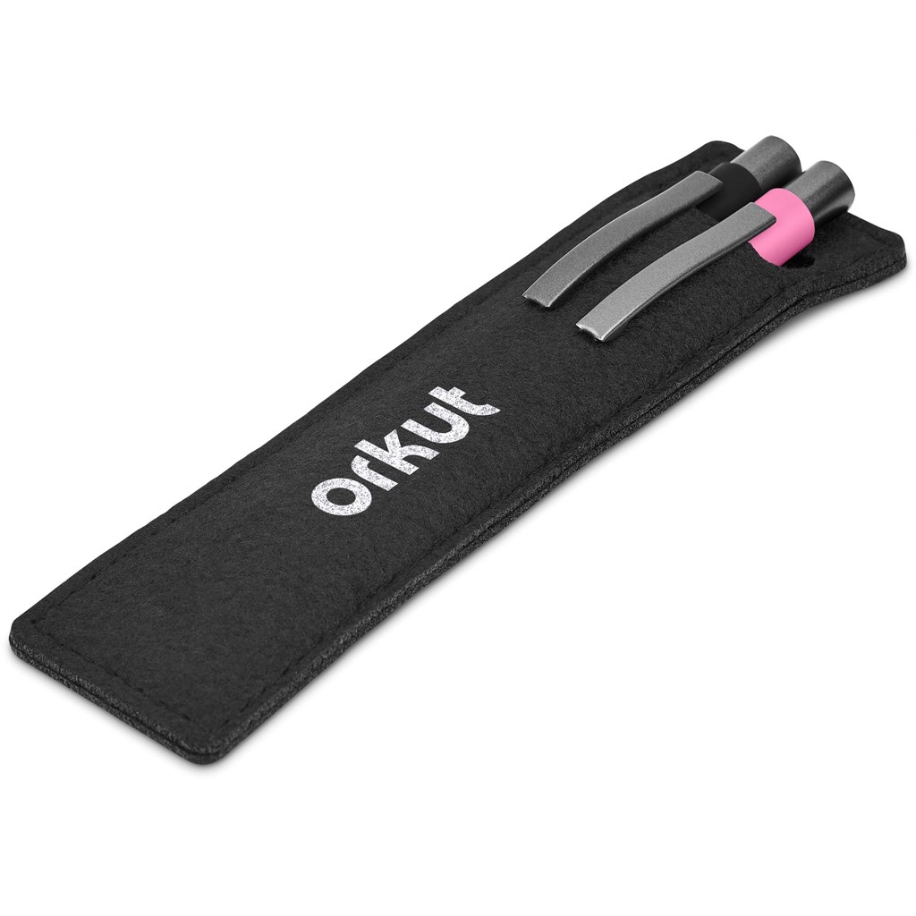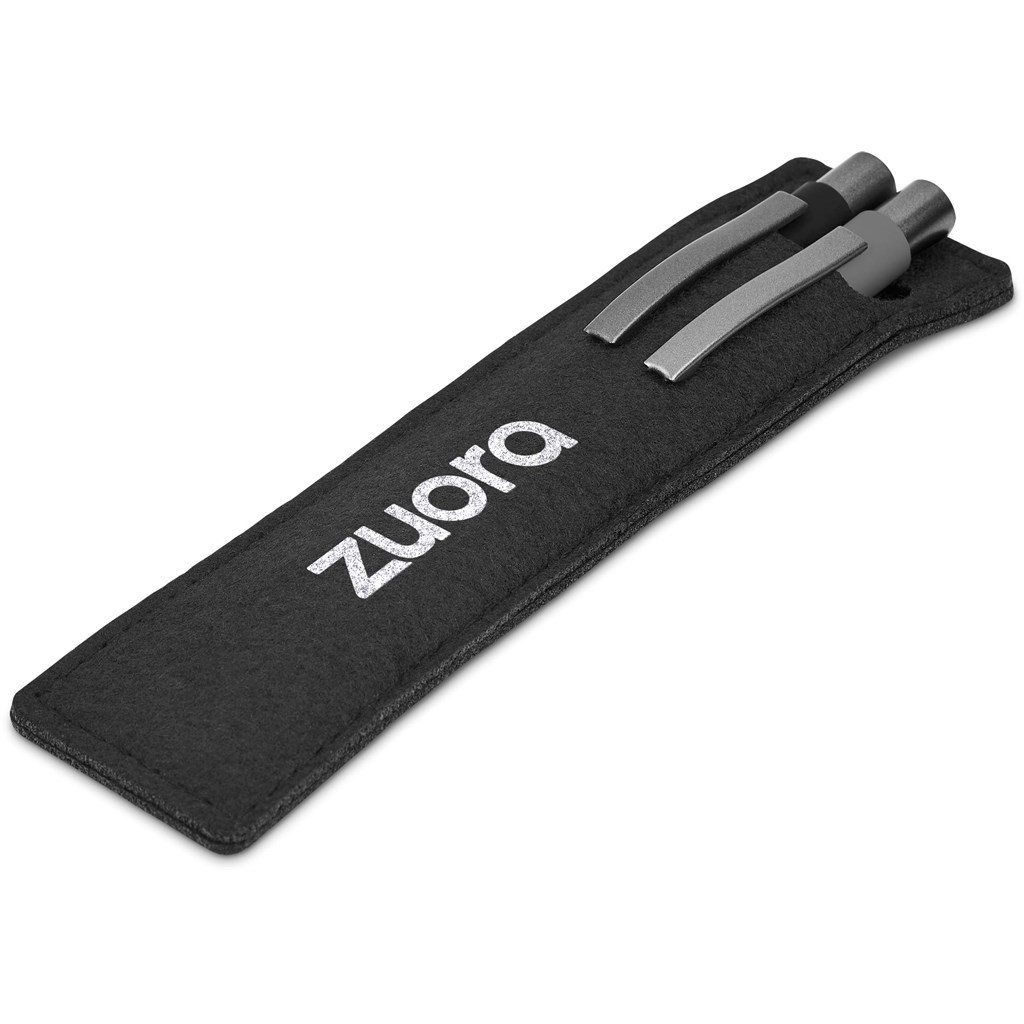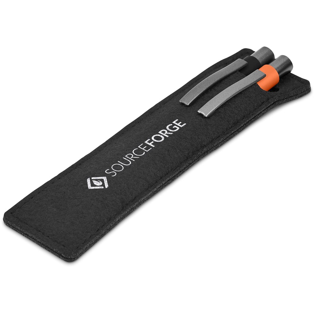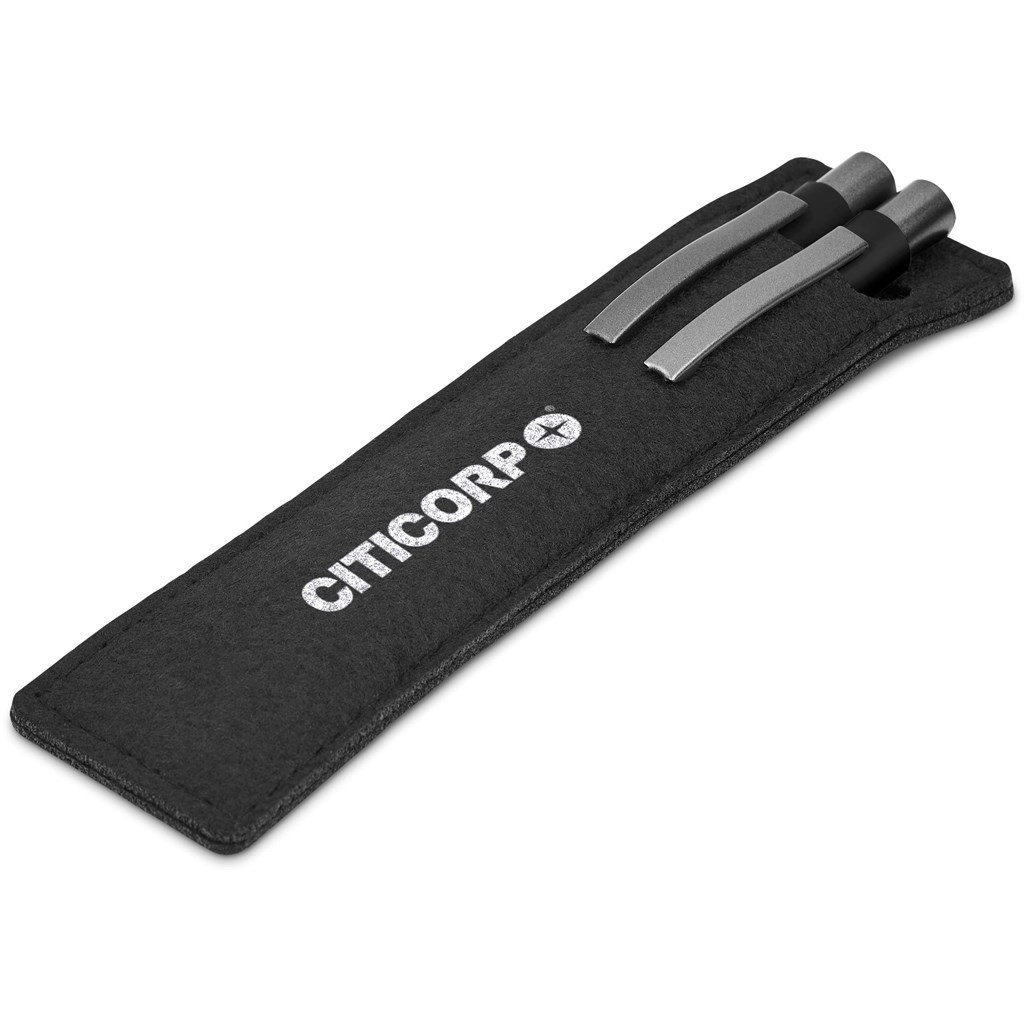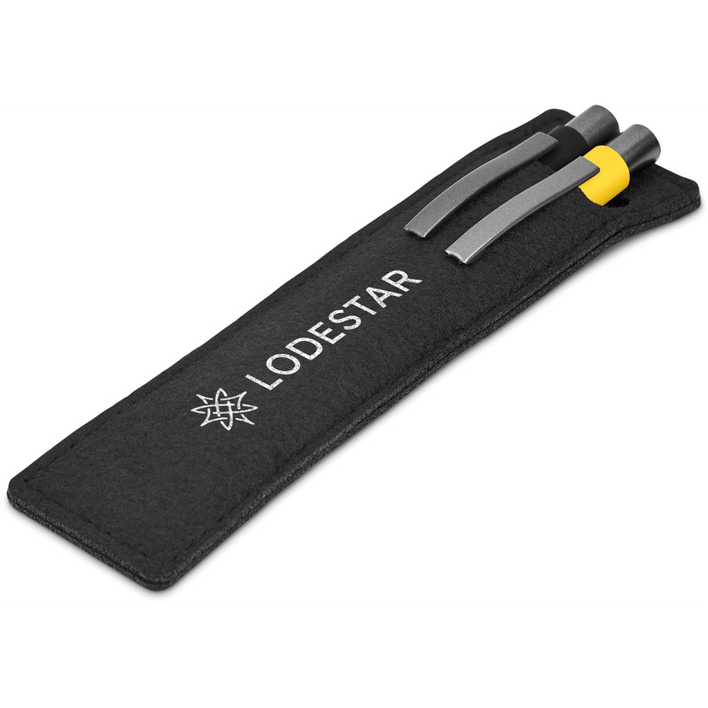 A black metal pencil and a metal pen in a choice of colours are paired together in a black pouch made from RPET felt. Laser engraving on the rubberised finish barrel of the pen and the pencil provides a clean precise effect which is both subtle and visible. The ball pen refill contains good quality, black German ink and will provide smooth, uninterrupted writing for a minimum of 1,500 metres. The pencil is fitted with break-resistant 0.5mm lead. A set with a different colour pen and pencil makes it easier to instantly identify which is the pen and which is the pencil.